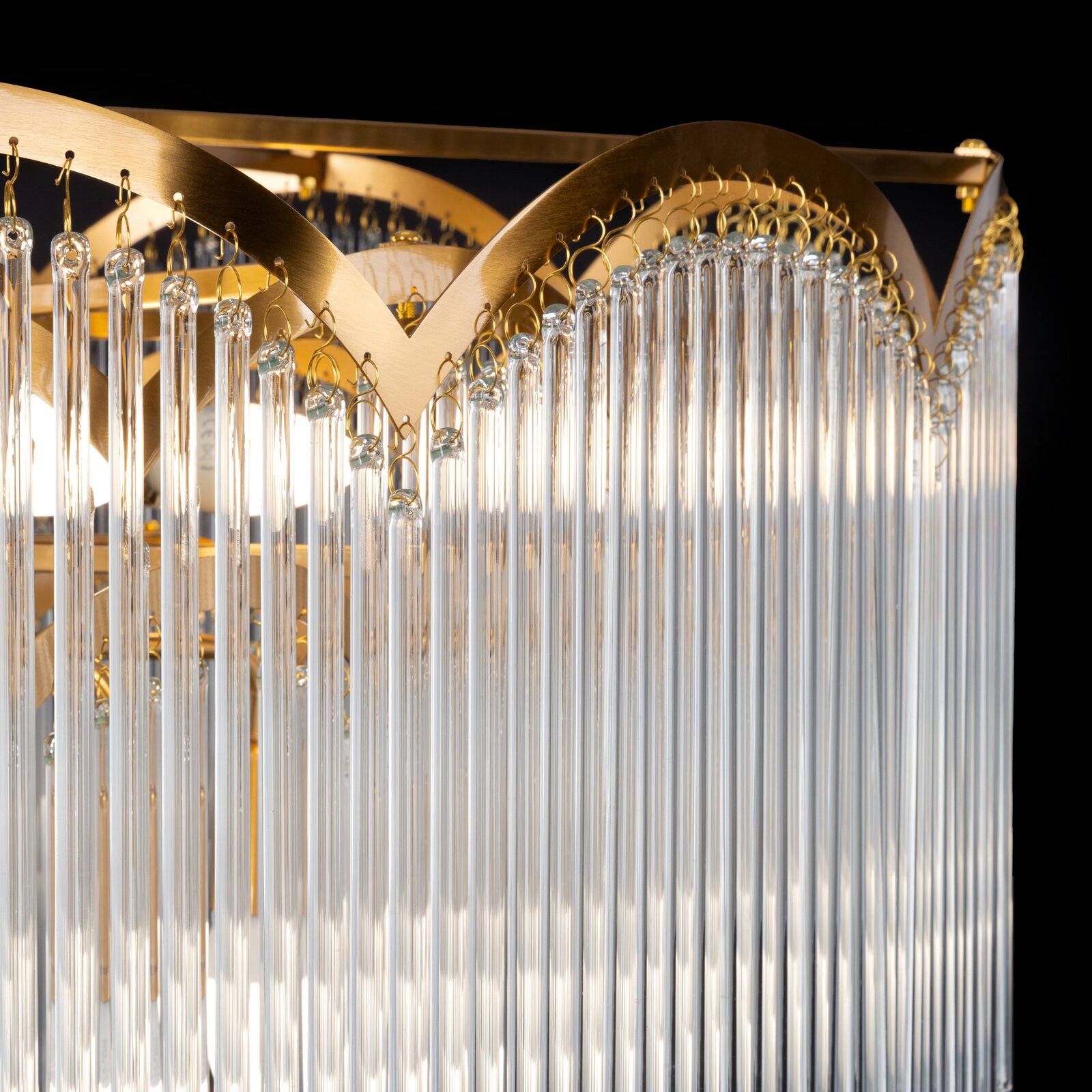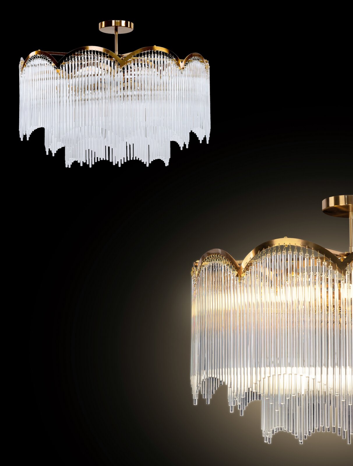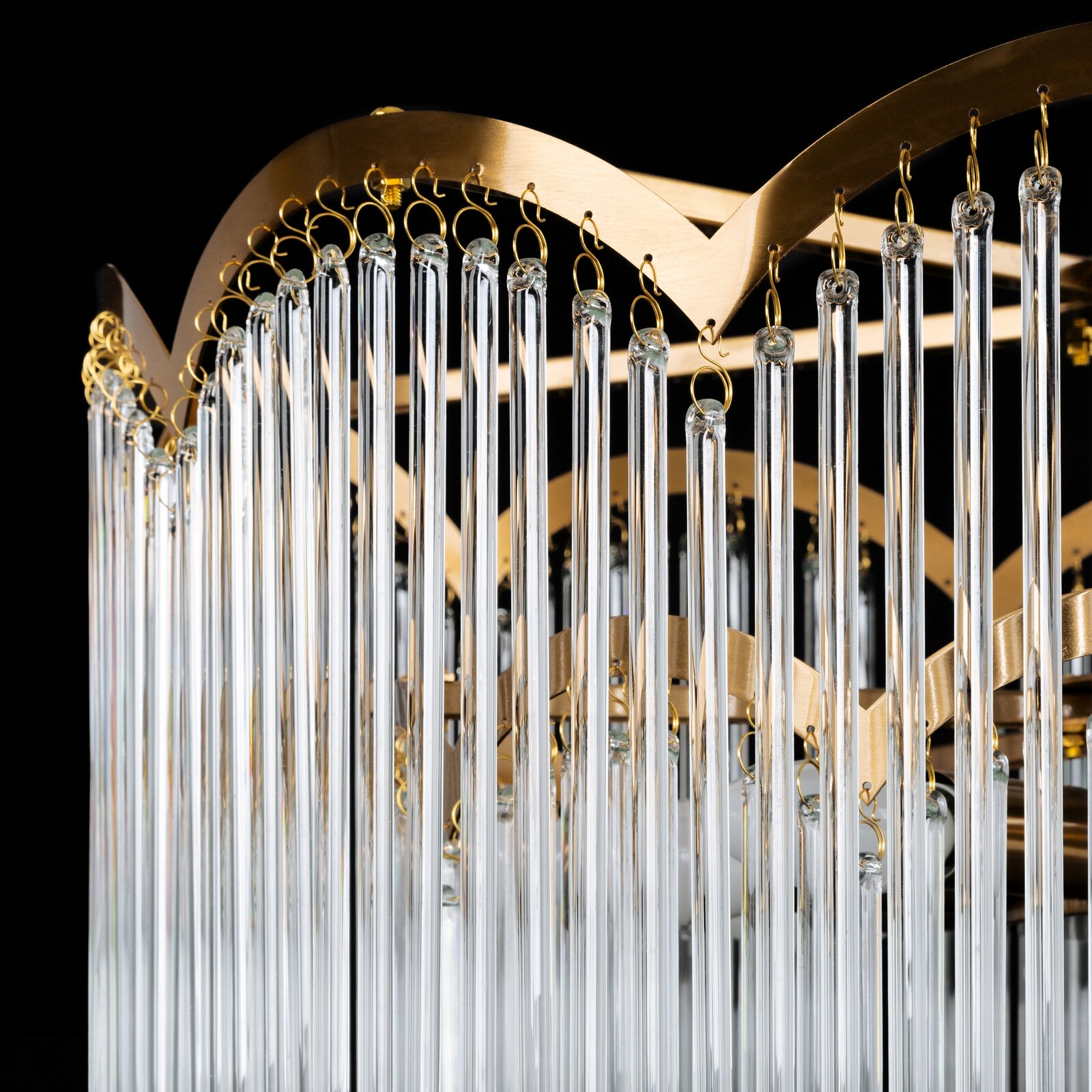 Elegancka forma lampy łączy w sobie tradycyjny szyk żyrandola z nowoczesnym minimalizmem, dzięki czemu sprawdzi się w salonie, jadalni czy reprezentacyjnym holu, wprowadzając do przestrzeni klasę i prestiż. Lampa pełni funkcję nie tylko oświetleniową, ale również dekoracyjną – jej złote elementy i szklane akcenty podkreślają ekskluzywny charakter wnętrza.