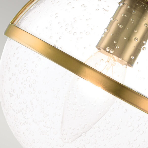 Dwa źródła światła ukryte w okrągłych kloszach kinkietu, wykonane zostały ze szkła ozdobionego efektownymi bąbelkami powietrza. Transparentna powierzchnia szkła pięknie rozprasza światło, nadając pomieszczeniom subtelności i delikatności. Metalowa konstrukcja, która otacza okrągłe klosze, podkreśla tradycyjny design lampy, dodając jej elegancji i wytworności. Postarzane wykończenie mosiądzu wraz ze szklanymi kloszami, tworzy połączenie, które doskonale współgra z bogato zdobionymi wnętrzami w stylu art déco.