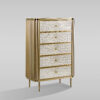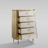 Oryginalna komoda w kolorze szampańskiego złota zachwyca luksusowym połączeniem eleganckich materiałów i dekoracyjnych detali. Fronty pięciu szuflad wykonane są z naturalnej muszli morskiej, której subtelne płytki tworzą harmonijny, symetryczny wzór o delikatnie perłowym połysku. Efekt ten podkreśla jasnokremowy odcień muszli, doskonale kontrastujący z ryflowanym korpusem w kolorze szampańskiego złota.