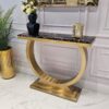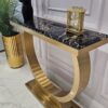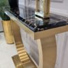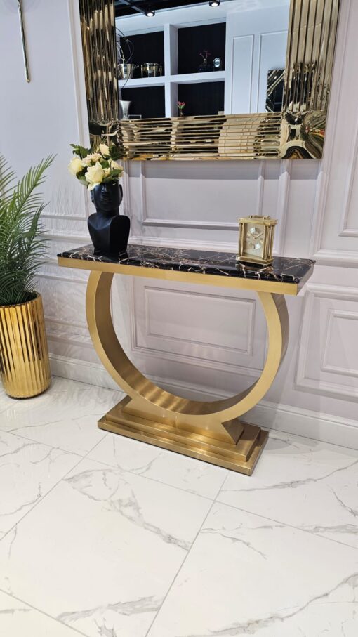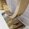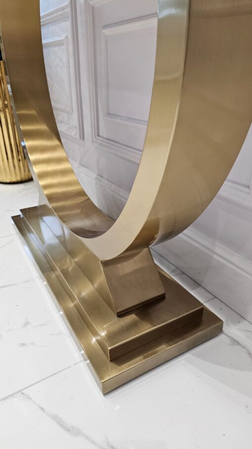 Złota konsola Ring to stylowy i elegancki mebel, który wyróżnia się swoim luksusowym wyglądem. Jej szczotkowana złota podstawa w formie okrągłego pierścienia nadaje całości wyjątkowego charakteru i przyciąga uwagę w każdym wnętrzu.