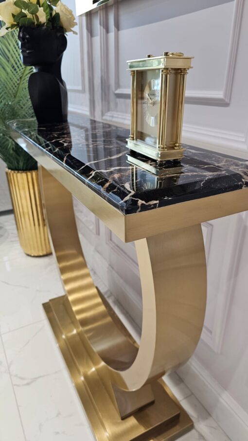 Blat konsoli został wykonany z konglomeratu marmurowego, dzięki czemu łączy estetykę naturalnego kamienia z praktycznym, trwałym wykończeniem. Subtelne połączenie złota i marmuru sprawia, że konsola pasuje zarówno do nowoczesnych, jak i klasycznych aranżacji. To idealny mebel do salonu, przedpokoju czy eleganckiego gabinetu.