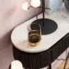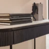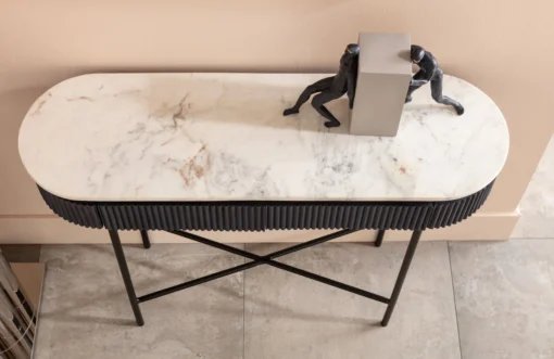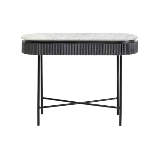 Metalowe nogi – solidne i stabilne, zapewniające trwałość i nowoczesny wygląd. Ryflowany, drewniany korpus – dodaje tekstury i elegancji, podkreślając designerski charakter mebla. Biały marmurowy blat – luksusowy, ponadczasowy akcent, łatwy w utrzymaniu czystości. Minimalistyczny, nowoczesny design – idealny do współczesnych wnętrz, łączy estetykę z funkcjonalnością. Wymiary konsoli (Sz. x Gł. x W.): 100 x 32 x 80 cm Kolor konsoli: Biały, Czarny, Szary Materiał: Drewno mango, Stal, Marmur, MDF