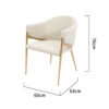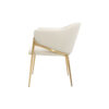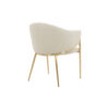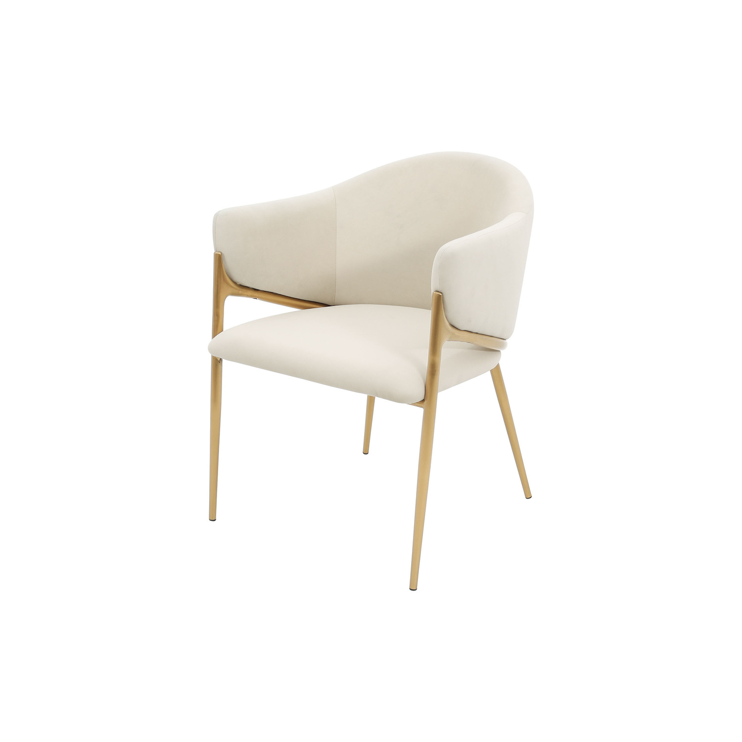 Krzesło tapicerowane w stylu glamour zachwyca elegancją i wyrazistym designem. Asymetryczna rama oraz nogi wykonane ze złotej, szczotkowanej stali nierdzewnej tworzą efektowną, geometryczną linię, która dodaje całości lekkości i nowoczesnego charakteru. Siedzisko i oparcie pokryte miękką, welurową tkaniną w odcieniu łamanej bieli wprowadzają subtelną harmonię, podkreślając luksusowy styl krzesła. Połączenie złota i weluru tworzy wyjątkowo szykowną formę, idealną do eleganckich aranżacji.
