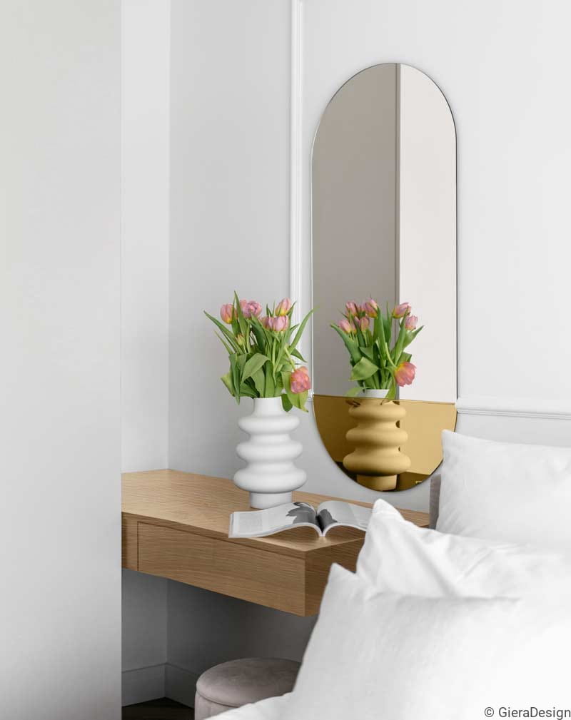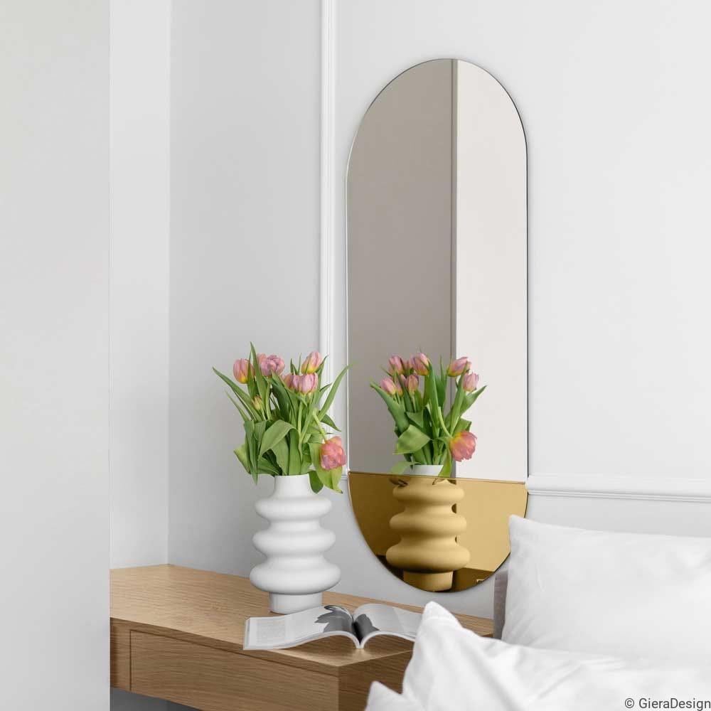 Lustro ścienne Novi to wyjątkowy model, łączący różnorodność kolorów i materiałów w harmonijną całość. Konstrukcję tworzą lustra o różnych barwach oraz złoty pasek wykonany z mosiądzu. Główna część tego modelu wykonana jest z najwyższej jakości belgijskich luster, prezentując się w eleganckim srebrnym odcieniu, natomiast uzupełnieniem jest lustrzany element w kolorze złotym. Te dwa elementy łączy delikatny pasek z polerowanego mosiądzu, dodając całości wyrafinowanego charakteru i szlachetności. Owalne lustro Novi będzie wspaniałą ozdobą do salonu, przedpokoju czy jadalni, a także idealnie wkomponuje się w aranżację łazienki.