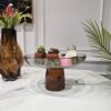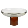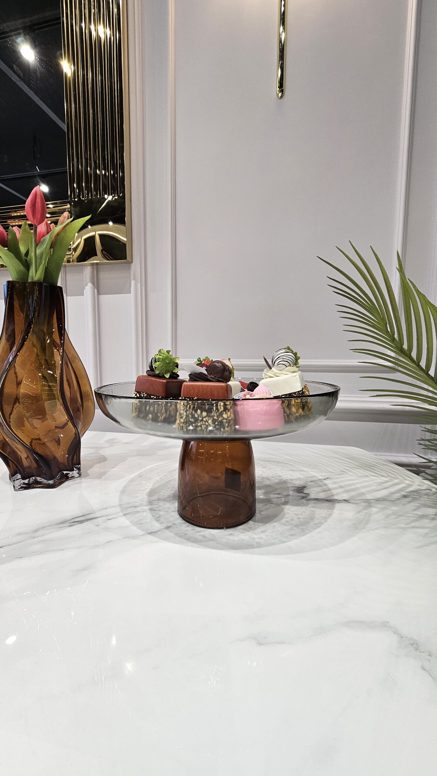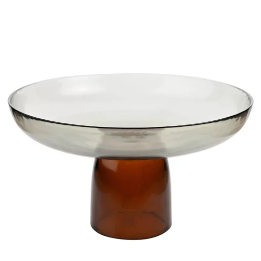 Misa osadzona jest na brązowej podstawie, która nadaje jej stabilności, kontrastowego akcentu i ciepłego wyglądu. Okrągły kształt sprawia, że misa wygląda harmonijnie i stylowo z każdej perspektywy, a połączenie szkła i ciemniejszego podwyższenia tworzy nowoczesną, wyważoną całość. To dekoracja idealna dla osób ceniących wyrafinowaną prostotę i elegancję.