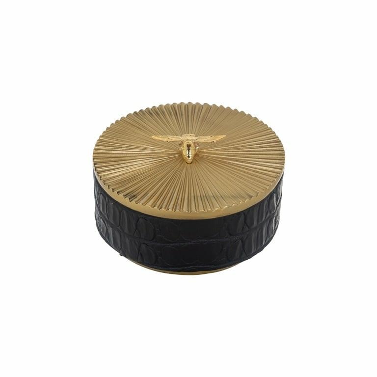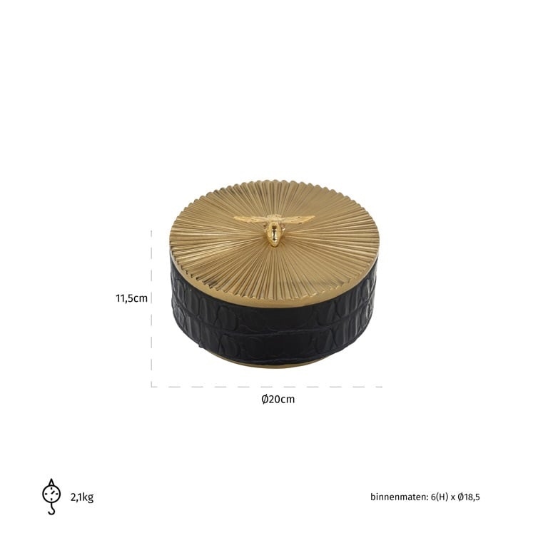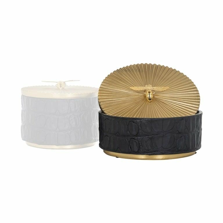 Odkryj luksusowy pojemnik na biżuterię Beez L – wyjątkowy dodatek, który podkreśli elegancję każdego wnętrza. To okrągłe pudełko dekoracyjne w stylu art déco, wykonane z wysokiej jakości żywicy, przyciąga wzrok swoim wyjątkowym designem. Całość ozdobiono piękną, czarną fakturą, imitującą skórę krokodyla, co nadaje mu niezwykłego uroku i prestiżu. Zwieńczeniem kompozycji jest pokrywka w złotym kolorze, ozdobiona delikatną złotą pszczołą, co dodaje mu jeszcze większego splendoru.