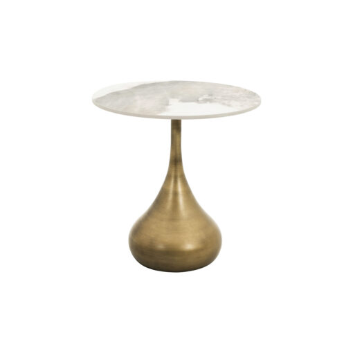 Ten stolik kawowy to połączenie minimalistycznej formy, elegancji złota i subtelnego uroku marmuru. Okrągły biały blat imituje marmur, wprowadzając do wnętrza lekkość i nowoczesny charakter. Złota podstawa, malowana i szczotkowana, dodaje całości wyrafinowanego blasku, idealnie komponując się z jasnym odcieniem blatu.