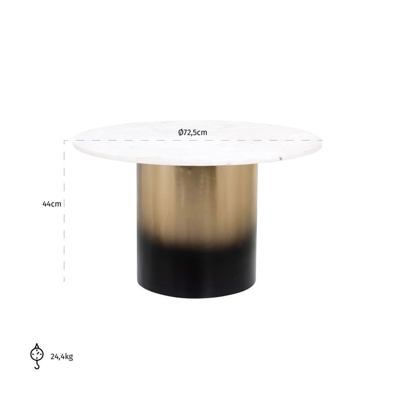 Stolik kawowy Alfie zachwyca swoim pięknym, okrągłym blatem wykonanym z konglomeratu marmurowego, który dodaje mu szlachetności i wyrafinowania. Metalowa podstawa stolika zaskakuje gradientowym wykończeniem, które przeplata elegancki czarny z antycznym złotem, tworząc niepowtarzalny efekt wizualny. Unikalne wzory i faktury marmurowego blatu dodają stolikowi wyjątkowego charakteru, które podkreślą styl Twojego wnętrza. To nie tylko stolik kawowy – to element, który doda blasku oraz luksusu do każdego salonu, stając się nieodłącznym elementem aranżacji, który przyciąga spojrzenia i dodaje charakteru przestrzeni.
