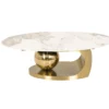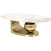 Stolik kawowy Balance zachwyca eleganckim i nowoczesnym wyglądem. Posiada okrągły blat ze spieku kamiennego o gładkiej, delikatnie połyskującej powierzchni, który dodaje całości wyrafinowanego charakteru. Jego złota podstawa w formie dekoracyjnej kuli stanowi efektowny akcent i przyciąga uwagę swoim połyskiem. Połączenie chłodnego kamienia z ciepłym odcieniem złota tworzy harmonijną, luksusową kompozycję. Minimalistyczna forma stolika sprawia, że wygląda lekko, a jednocześnie elegancko i stylowo.