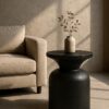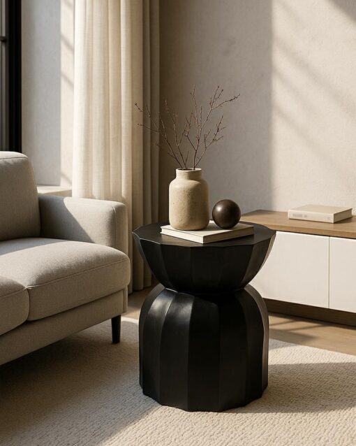 Ten wyjątkowy stolik łączy nowoczesny design z ponadczasową elegancją, tworząc harmonijną kompozycję stylu i funkcjonalności. Wykonany z drewna mango, zachwyca naturalnym charakterem oraz unikalnym usłojeniem, dzięki któremu każdy egzemplarz ma indywidualny, niepowtarzalny wygląd. Głęboka czerń nadaje meblowi wyrazistości i klasy, doskonale komponując się zarówno z nowoczesnymi, jak i klasycznymi aranżacjami. Innowacyjny kształt podkreśla jego dekoracyjny charakter, czyniąc z niego elegancki akcent w każdym wnętrzu. Produkt dostępny jest również w wersji beżowej, co pozwala dopasować go do różnych stylów i kolorystyk.