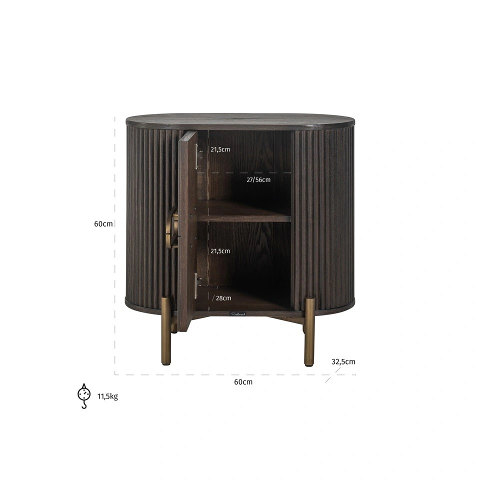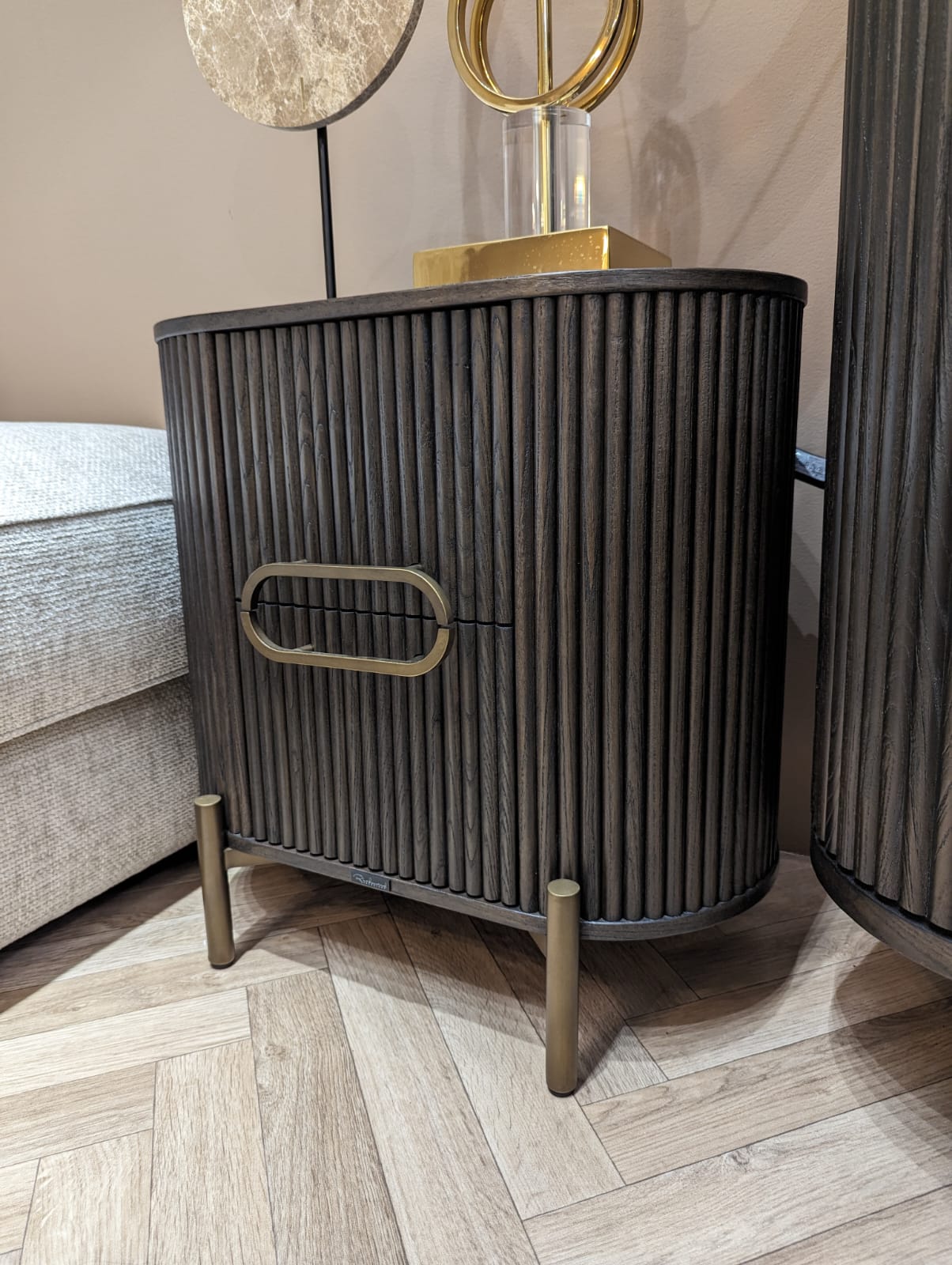 STOLIK NOCNY Luxor z drewna dębowego, ryflowany korpus, złote detale, klasyczna