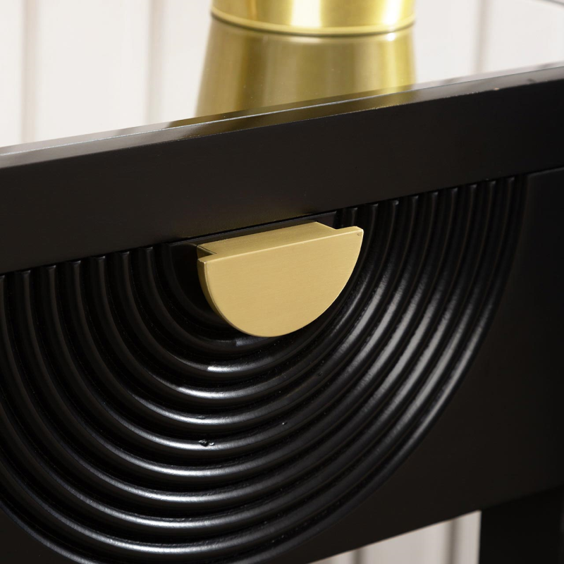 Pojemna szuflada zapewnia dodatkową funkcjonalność, umożliwiając przechowywanie drobiazgów czy przedmiotów codziennego użytku. Połyskujący, złoty uchwyt tworzy harmonijną równowagę pomiędzy surowością a elegancją. Wykonana z trwałych materiałów, prezentuje surowe wykończenia, które nadają jej unikatowego stylu.