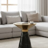 Podkreśleniem elegancji i luksusowego wykończenia stolika pomocniczego jest jego podstawa w kolorze złota. Jej półokrągłe, zaokrąglone tafle wykonane ze stali nierdzewnej nadają całości wyjątkowej lekkości i finezji, tworząc harmonijną kompozycję z kamiennym blatem.