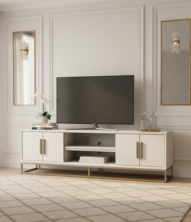 Beżowa szafka RTV nie tylko zachwyca estetyką, ale również funkcjonalnością. Przemyślany design zapewnia wystarczającą ilość miejsca na sprzęt RTV, a także dodatkowe półki do przechowywania drobnych przedmiotów. Mosiężne akcenty w połączeniu z dębowym fornirem tworzą efektowny kontrast, który sprawia, że szafka staje się centralnym punktem każdego salonu, dodając mu nowoczesnego, a jednocześnie ciepłego charakteru.