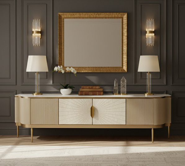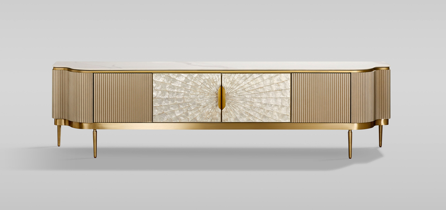 Dzięki harmonijnemu połączeniu drewna, marmuru i muszli, szafka pasuje do różnych stylów aranżacji. Doskonale komponuje się zarówno z nowoczesnymi, jak i klasycznymi wnętrzami, wnosząc do nich wyjątkowy styl i luksus. -