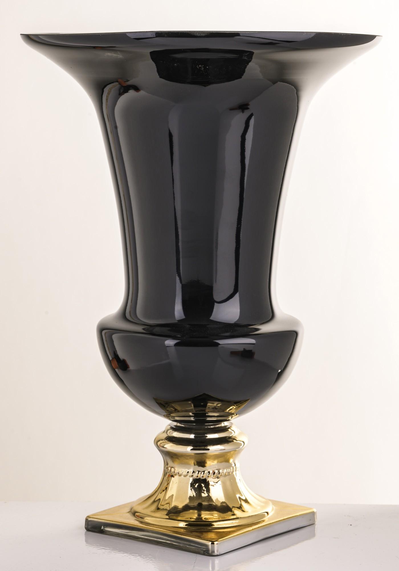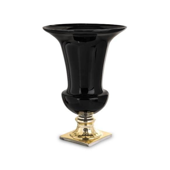 Wazon o eleganckim designie, w formie kielicha, tworzy wyrafinowany dodatek, który niewątpliwie stanie się centralnym punktem każdego pomieszczenia. Wykonany ze szkła w czarnym, głebokim odcieniu emanuje luksusowym charakterem. Szklana, połyskująca powierzchnia wazonu pięknie odbija światło, a złota, dekorowana podstawa, nie tylko nadaje stabilności całej konstrukcji, ale również dodaje jej lekkości i elegancji, w klasycznym stylu.