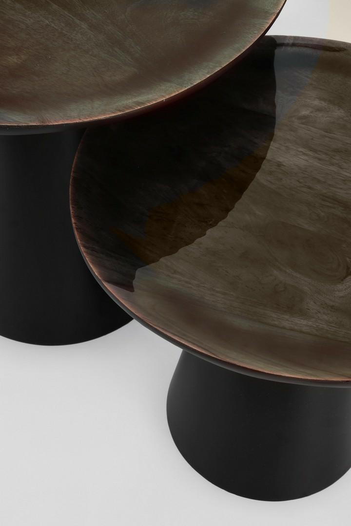Zestaw stolików kawowych to eleganczne połączenie litego drewna mango z solidną metalową podstawą. Blaty wykończone emalią zachwycają subtelnym połyskiem i naturalnym rysunkiem drewna, podkreślając unikatowy charakter każdego elementu. Stożkowa forma oraz matowe, czarne wykończenie podstawy nadają całości nowoczesny i industrialny charakter. Dzięki różnym wysokościom stoliki mogą być ustawiane razem lub oddzielnie, co zapewnia elastyczne dopasowanie do potrzeb przestrzeni. To propozycja, która łączy funkcjonalność z eleganckim designem.